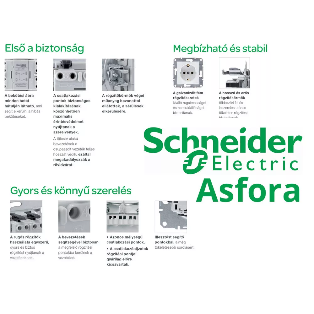 Az Asfora család a Schneider Elektric megszokott, kiváló minőségét kínálja. A galvanizált fém rögzítőkeretek kiváló rugalmasságot és korrózióállóságot biztosítanak. A hosszú és erős rögzítőkörmök többszöri fel és leszerelés után is tökéletes rögzítést biztosítanak.