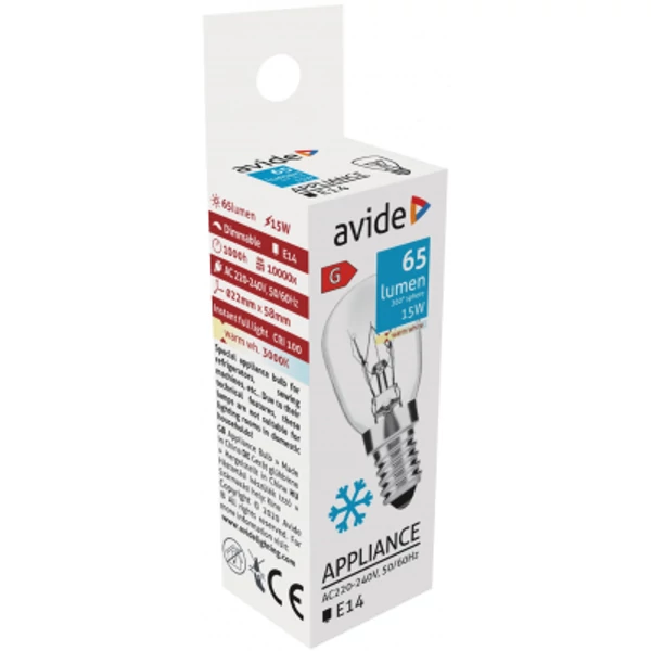 - Az Avide termékpalettája 15 és 25 W-os, E14-es talpú, meleg fényű, 3000 K lumen fényerejű izzókat is tartalmaz, amelyeket hűtőszekrényben és sütőben használnak.