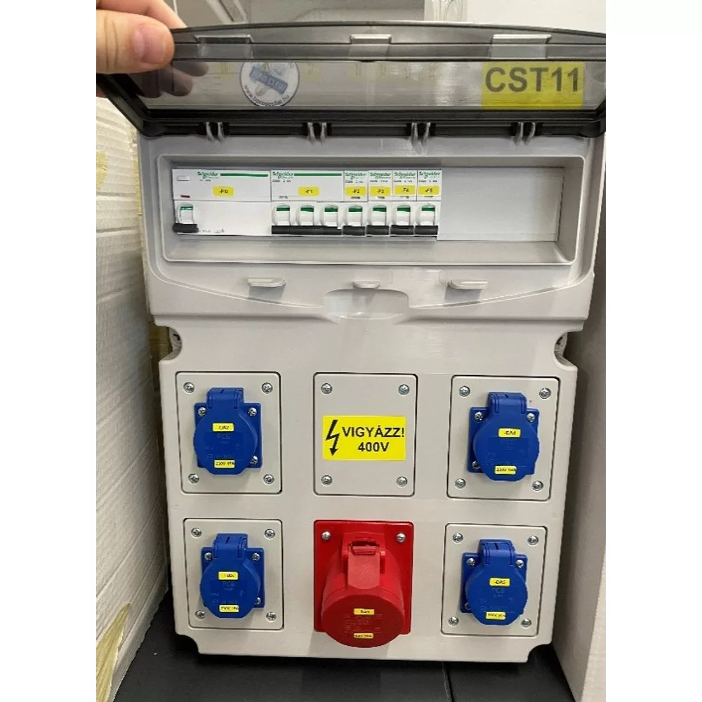 - A szekrényben egy darab 5 pólusú, 16 A névleges áramerősségű, 400 V feszültségű ipari csatlakozó aljzat található, amely háromfázisú berendezések működtetésére alkalmas. Az egyfázisú fogyasztók ellátását négy darab 2P+PE típusú, 16 A névleges áramerősségű, 230 V feszültségű csatlakozó aljzat biztosítja, amelyek háztartási és kisebb ipari készülékek biztonságos csatlakoztatását teszik lehetővé.