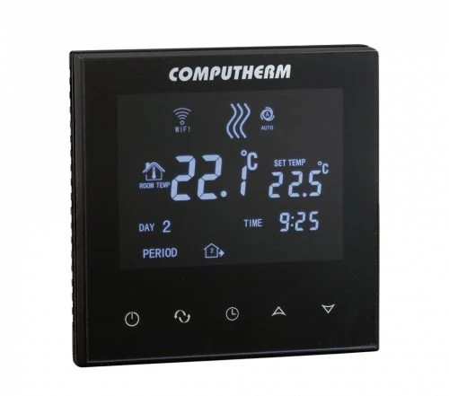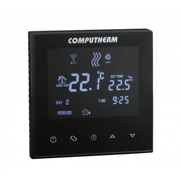A COMPUTHERM E300 Wi-Fi termosztát a COMPUTHERM E280 Wi-Fi termosztátnak egy fejlettebb változata, fehér helyett fekete színnel, üveg előlappal és még modernebb kijelzővel.
