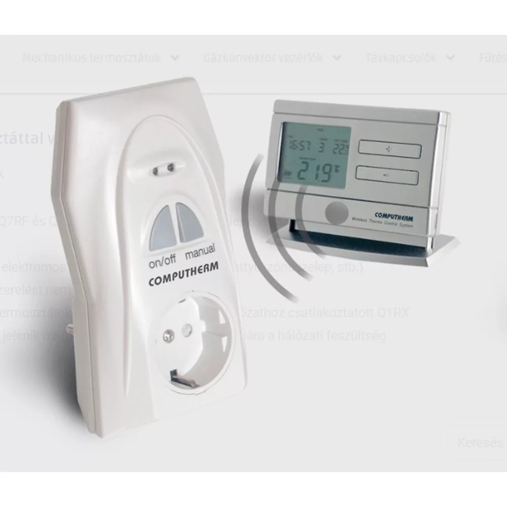 - A COMPUTHERM Q1RX dugalj a COMPUTHERM Q3RF, Q7RF és Q8RF termosztátokhoz lett kifejlesztve, azok vevőegysége mellett/helyett használható. A készülék alkalmas kazán vagy más 230 V-tal üzemelő elektromos készülék (pl. hősugárzó, szivattyú, zónaszelep, stb.) vezérlésére. Üzembe helyezése, használata egyszerű, szerelést nem igényel. A COMPUTHERM Q3RF, Q7RF és Q8RF vezeték nélküli termosztátok bekapcsoló utasítására a hálózathoz csatlakoztatott Q1RX készülék kimeneti dugalján a 230V-os hálózati feszültség jelenik meg, ill. a kikapcsoló utasítás hatására a hálózati feszültség kikapcsolódik.