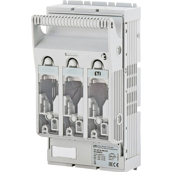 A ETI 001690870-es típusú KVL-00 3p M8-M8 biztosítós szakaszoló olyan hárompólusú, szerelőlapra rögzíthető készülék, amely 160 A névleges áramra, NH00 méretű biztosítékkal felszerelt rendszerekhez készült. A készülék 690 V váltó- és 440 V egyenáramú üzemi feszültségre van minősítve, és AC-23B / DC-22B alkalmazási kategóriát teljesít, tehát készül ipari berendezések kapcsolására is. A csatlakozás mindkét oldalon M8-as menetes csatlakozóval történik, a rögzítés csavaros szerelési módot igényel, és a kivitel olyan vízszintes elrendezésű biztosítós szakaszolókapcsoló, amit főként elosztó-, kapcsolószekrényes rendszerekben alkalmaznak. A termék a szabványos NH00 biztosítékmenetekkel és megfelelő mechanikai kialakítással rendelkezik a nagyáramú szakaszolási feladatokhoz.