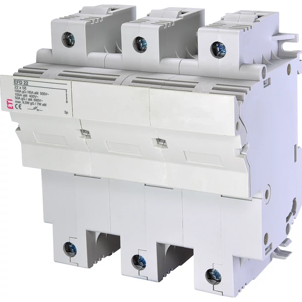 Az ETI 002570004 EFD 22 3P 22x58 3P biztosítós szakaszoló 80A egy hárompólusú, 80 amper névleges áramerősségű készülék, amely 22x58 milliméteres olvadóbiztosítékokhoz készült. Ipari és villamos elosztórendszerekben használható az áramkörök védelmére és biztonságos leválasztására. Tartós és megbízható kialakítása hosszú távú biztonságos működést biztosít, miközben a DIN-sínre történő szerelhetőség egyszerű telepítést és karbantartást tesz lehetővé.
