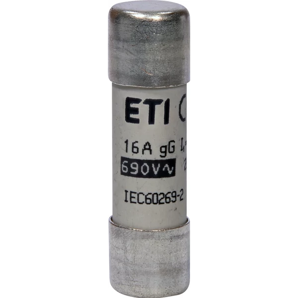 Az ETI 002651030 jelzésű biztosító hengeres kialakítású, 14x51 mm méretű betét, amely 16 amper névleges áramerősségre van tervezve. A készülék 690 volt feszültségig alkalmazható, gG jelölése szerint általános célú biztosító, amely mind túlterhelés, mind rövidzárlat esetén védelmet nyújt az áramköröknek. A biztosító megbízható működést biztosít az elektromos berendezések számára, hosszú élettartammal rendelkezik, és cseréje egyszerűen elvégezhető, így hatékonyan járul hozzá a készülékek és rendszerek biztonságához.