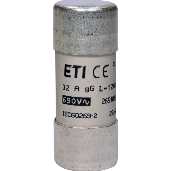 Az ETI 002651045 típusú biztosíték egy 22x58 mm méretű, 32 amperes névleges áramú, hengeres kialakítású biztosító betét. Legfeljebb 690 volt váltakozó feszültségű hálózatokban használható, általános célú (gG jelű) túláramvédelemre. Megbízható védelmet nyújt túlterhelés és rövidzárlat esetén ipari, kereskedelmi és villamos elosztóberendezésekben. Stabil működést, magas megszakítóképességet és hosszú élettartamot biztosít, ezáltal biztonságos üzemeltetést garantál a villamos rendszerekben.