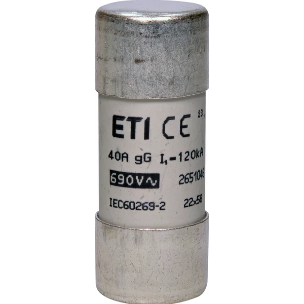 Az ETI 002651046 típusú biztosíték egy 22x58 mm méretű, 40 amperes névleges áramú, hengeres kialakítású biztosító betét. Legfeljebb 690 volt váltakozó feszültségű hálózatokban használható, általános célú (gG jelű) túláramvédelemre. Kiválóan alkalmas ipari berendezések, elosztószekrények és villamos rendszerek védelmére túlterhelés és rövidzárlat ellen. Magas megszakítóképessége és megbízható működése hosszú élettartamot, valamint biztonságos és stabil üzemeltetést garantál.