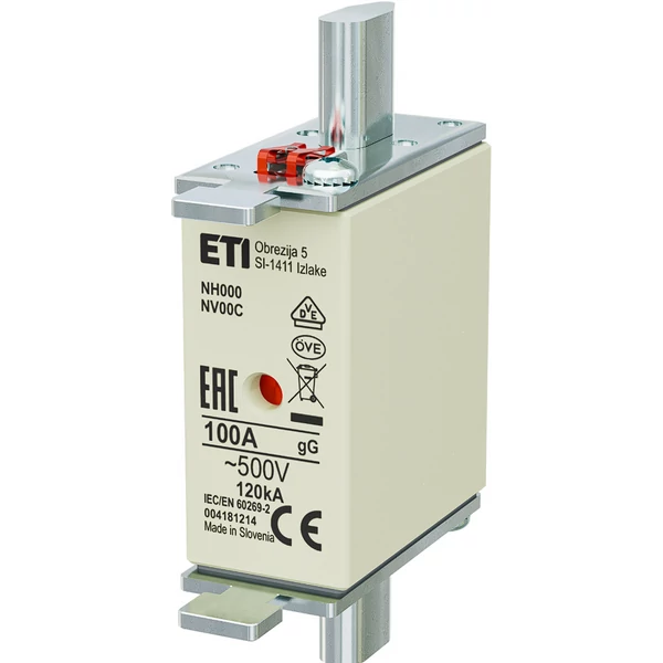 A ETI 004181214 NH000 gG 100A/500V késes biztosítóbetét egy NH-rendszerű (méret NH000) olvadóbetét, melynek névleges áramerőssége 100 A, névleges váltakozófeszültsége 500 V, egyenfeszültség esetén 250 V. A karakterisztikája gG (régebben gL), tehát teljes tartományú megszakításra alkalmas, kábelek és berendezések védelmére. A megszakítóképessége AC oldalon 120 kA. A „KOMBI” kivitel kombinált állapot-jelzővel rendelkezik: a biztosítéktest homloklapján és oldalfelületén is található kiolvadás-jelzés. Az energia-disszipáció ~6,6 W, I²t értéke kb. 141 000 A²s, a pre-arc (kiolvadás előtti) értéke kb. 25 000 A²s. A termék megfelel az IEC 60269-1 és IEC 60269-2 szabványoknak.