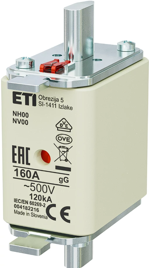 A ETI 004182216 NH00 160 A gG 500 V KOMBI késes biztosítóbetét egy NH00 méretű (NV/NH00) késes olvadóbetét, amelyet az általános célú kábel‑ és berendezés‑védelemre terveztek. Névleges áramerőssége 160 A, névleges váltakozófeszültsége 500 V, egyenfeszültség esetén 250 V. A karakterisztikája gG (régebben gL), vagyis a teljes tartományú védelemre alkalmas. A megszakítóképessége váltakozó áram esetén 120 kA. A „KOMBI” kivitel két kioldásjelzővel rendelkezik: az egyik a homloklapon, a másik a kerámiatest oldalán található. Az energia‑disszipáció névleges áram mellett 11,2 W, az I²t (üzemi energia) értéke kb. 275 000 A²s, az előírt kiolvadási érték (pre‑arcing) kb. 73 600 A²s. A biztosító a szabványoknak megfelel – különösen az IEC 60269‑1 és IEC 60269‑2 szerint. Az olvadószál rézből készül, az érintkezők ezüst‑bevonattal vannak ellátva, a ház pedig szteatit (kerámia alapú) anyagból készül, magas hőállósággal. Ez az eszköz tipikusan ipari elosztószekrényekben, gépbetáplálásoknál vagy olyan szakaszoknál alkalmazható, ahol magas zárlati áramok valószínűsíthetők és teljes tartományú védelem szükséges.