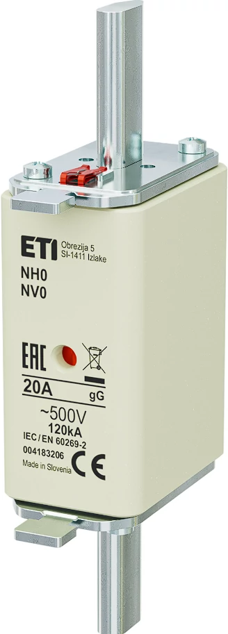 Az ETI 004183206 típusú biztosító NH0 (NV/NH0) méretű késes olvadóbetét, amelyet kisfeszültségű hálózatokban általános túláramvédelemre terveztek. Névleges árama 20 amper, névleges váltakozófeszültsége 500 volt. A gL-gG karakterisztika teljes tartományú védelmet biztosít, tehát a biztosító mind a kis, mind a nagy zárlati áramokat képes megszakítani, így alkalmas kábelek, vezetékek és berendezések védelmére. A „KOMBI” kivitel azt jelenti, hogy a biztosító állapotát két jelző mutatja: az egyik a homloklapon, a másik a kerámiatest oldalán látható, ami megkönnyíti az olvadás ellenőrzését. A biztosító szteatit (kerámia) házzal rendelkezik, az olvadószál rézből készül, az érintkezők felülete ezüstözött, ami biztosítja a megfelelő hő- és áramvezetést. A névleges megszakítóképesség AC oldalon 50 kA körüli, az energia‑veszteség alacsony, az eszköz megfelel az IEC 60269-1 és IEC 60269-2 szabványoknak. A biztosító ideális kisáramú ipari alkalmazásokhoz, gépek betáplálására és kábelvédelemre.