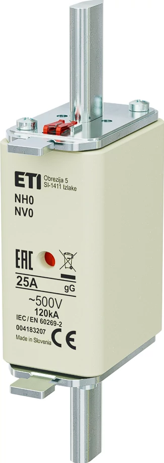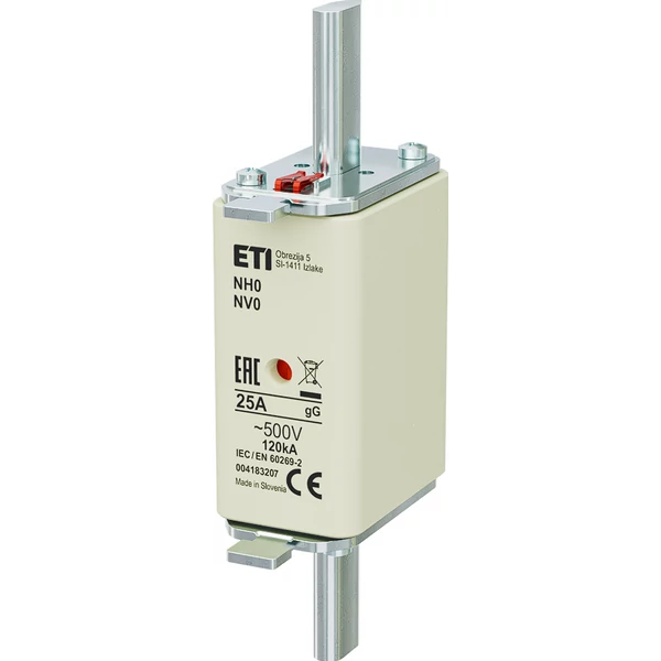 Az ETI 004183207 NH0 méretű késes biztosító betét gL-gG karakterisztikájú, 25 amper névleges áramerősséggel és 500 volt névleges feszültséggel rendelkezik. Általános célú, kábel- és berendezésvédelmi alkalmazásokra alkalmas. A megszakítóképessége 120 kA AC oldalon, DC oldalon 250 V. A biztosító háza szteatitból készült porcelán, belsejében kvarchomokkal töltve, a réz olvadószál precízen hegesztett, az érintkező kések ezüst- vagy nikkelbevonattal készülnek. A kombi kivitel jelzi a biztosító kiolvadását vagy szakadását, így vizuálisan is nyomon követhető az állapota. A termék megfelel az IEC 60269-1 és IEC 60269-2 nemzetközi szabványoknak, ipari és kereskedelmi felhasználásra tervezett, megbízható védelmet biztosítva.
