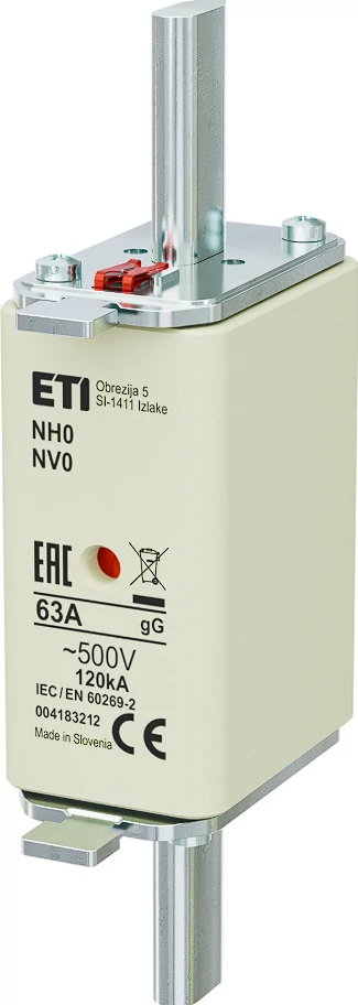 A termék, a ETI004183212 NH0 gG 63A/500V késes biztosítóbetét, egy NH0 méretű, gG karakterisztikájú késes olvadóbiztosító betét, névleges áramerőssége 63 A és névleges feszültsége 500 V AC (és 250 V DC). A megszakítóképessége AC-oldalon 120 kA, az indikátor „kombi” típusú, tehát a biztosító állapotváltozása vizuálisan is követhető. Az alkalmazási terület főként kábelvédelem, kivitele és paraméterei megfelelnek az IEC 60269-1 és IEC 60269-2 szabványoknak.