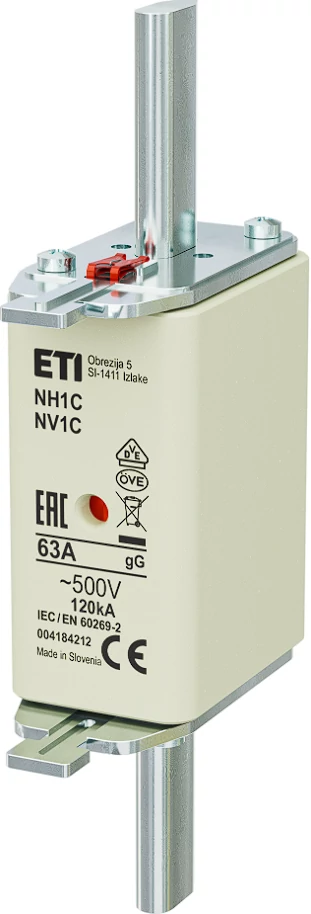 Az ETI 004184212 típusú késes biztosító‑betét NH1C méretű, gG karakterisztikájú és 63 A névleges áramerősségű. A készülék 500 V váltó‑ és 250 V egyenáram‑feszültségre van tervezve, és kombinált állapotjelzővel rendelkezik, így a biztosító kiégett állapota vizuálisan is felismerhető. Magas megszakítóképessége miatt megbízható védelmet nyújt túlterhelés és rövidzárlat esetén egyaránt, alkalmas kábelek és berendezések védelmére ipari és villamos hálózati alkalmazásokban. A készülék megfelel az IEC 60269‑1 és IEC 60269‑2 szabványoknak, robusztus szerkezetű és hosszú élettartamú kialakítású.