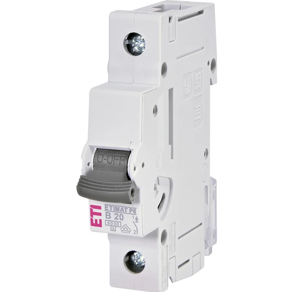 Az ETI 1900011 ETIMAT P6 B20A 1P 6 kA egy egypólusú, 20 amperes kismegszakító, amely a túláram és a rövidzárlat elleni védelmet biztosít egyfázisú hálózatban. A készülék B karakterisztikájú, ami azt jelenti, hogy viszonylag gyorsan kapcsol ki kisebb túlterhelések esetén is. Rövidzárlati megszakítási képessége 6 kA, tehát ilyen nagyságrendű zárlati áramokat képes biztonságosan lekapcsolni. A moduláris kialakítás révén szabványos DIN sínre szerelhető, és 1 modul szélességnek felel meg.