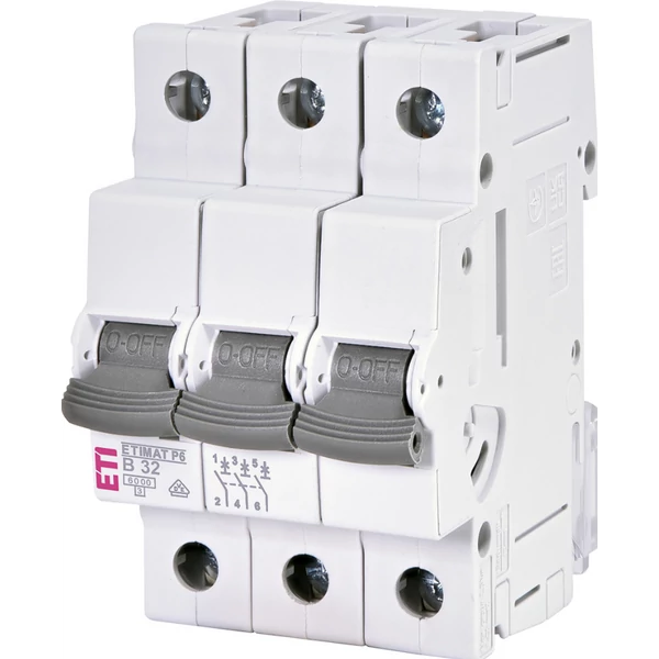 Az ETI 1900313 ETIMAT P6 B32A 3P 6 kA egy hárompólusú (három modul szélességű) kismegszakító, amelyet háromfázisú hálózatok védelmére alkalmaznak. A névleges áram 32 amper, és B karakterisztikájú, ami azt jelenti, hogy a készülék viszonylag gyorsan reagál kisebb túlterhelésekre is. A megszakítási képessége 6 kA, tehát ilyen nagyságrendű rövidzárlati áramot képes biztonságosan lekapcsolni. A szerkezet szabványos DIN sínre szerelhető, és alkalmas ipari vagy nagyobb méretű elektromos rendszerek védelmére.