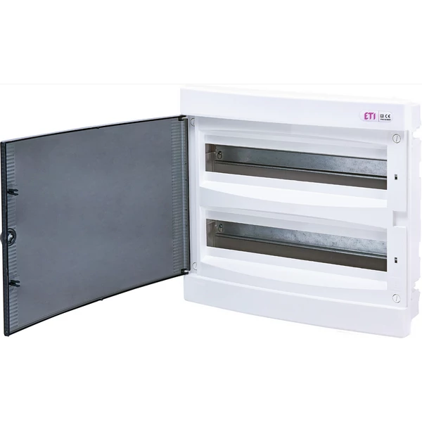 Az ETI 1101083 ECM 2x18PT DIDO-E 2x18 elosztó szekrény egy süllyesztett kivitelű, fehér műanyagból készült elektromos elosztószekrény, amely 36 modulos helyet kínál két sorban, mindegyikben 18 modullal. Az átlátszó műanyag ajtóval ellátott készülék IP40-es védettséggel rendelkezik, ami por- és fröccsenő víz ellen biztosít védelmet. A névleges feszültsége 400 V, míg a névleges áram 63 A