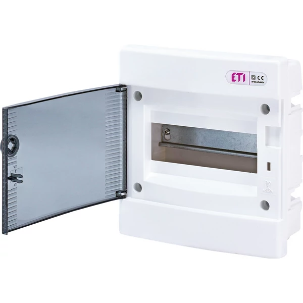 ETI ECM8PT (4+4) DIDO-E 1×8 modulos elosztó szekrény (cikkszám 1101010) olyan beépített (süllyesztett) műanyag doboz, amely átlátszó ajtóval rendelkezik, és összesen 8 modullal (1 sor = 8 modul) használható. Az eszköz IP40 védettséget biztosít, névleges feszültsége 400 V, névleges áramértéke 63 A. A doboz anyaga lángálló (650 °C), és belsőleg 8-8 PE/N sorkapocs áll rendelkezésre. Méretek kb. 211 × 32 × 99 mm külső méret, beépítési mélysége 68 mm, UV-álló és tartós kialakítás jellemzi.