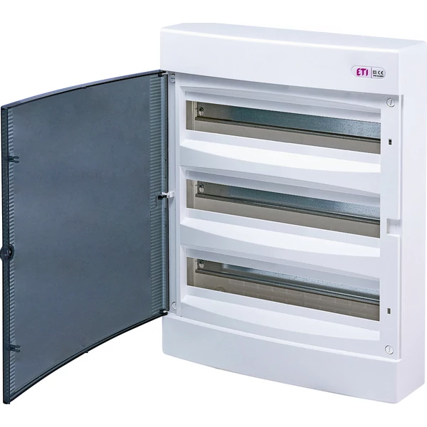 Az ETI ECT 3×18PT DIDO-E elosztó szekrény falra szerelhető kivitelben, három sorban 18 modul befogadására alkalmas, így összesen 54 modul elhelyezésére ad lehetőséget. A szerkezet fehér műanyagból készül, az előlapjába átlátszó műanyag ajtót építettek, amely lehetővé teszi a belső modulok áttekintését anélkül, hogy kinyitnád a szekrényt. A termék IP40 védettségi besorolással bír, névleges feszültsége 400 V, névleges áramra tervezve 63 A értékkel. A belső kialakításban 26 PE és 26 N kapocs áll rendelkezésre, az anyag lángállósága pedig megfelel a 650 °C-os izzóhuzalos vizsgálatnak.