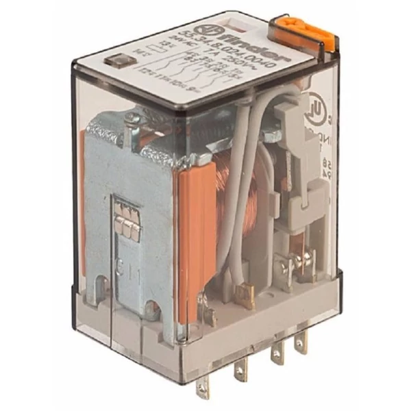 55.34-es típusú miniatűr ipari relék dugaszolható kivitelben, 4 váltóérintkező, 7 A. Alkalmazható a 94-es sorozatú foglalatokkal.