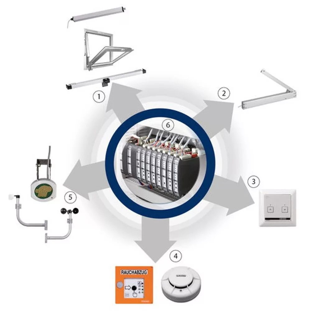 Az EMB8000+ moduláris vezérlőközpont egy digitális BUS technológiával és tápellátással felszerelt vezérlőmodul csoport , amely 24V-os egyenáramú ablaknyitó hajtások vezérlésére szolgál hő- és füstelvezetési (RWA) és természetes, komfort szellőztetési funkciókhoz kis és közepes épületrészekben. A vezérlőközpont BMS/LON/CAN rendszerre közvetlenül csatlakoztatható modul rendszerű vezérlő rendszer 230 VAC 50 Hz tápfeszültség, 24 VDC üzemi feszültség, 5-72 A terhelhetőségig alap kiépítésben, körönként akár 20 db 1 A-es motorhoz. A programozás, átprogramozás minden esetben akár utólag, a telepítés helyszínén, vagy már beüzemelt rendszer esetén is elvégezhető. Így a tervezéskor nem kalkulált, kivitelezés közben létrejött, vagy a telepítést követően kialakult problémák (pl. áttervezett, átalakított hő- és füstelvezető rendszer) megoldhatók.