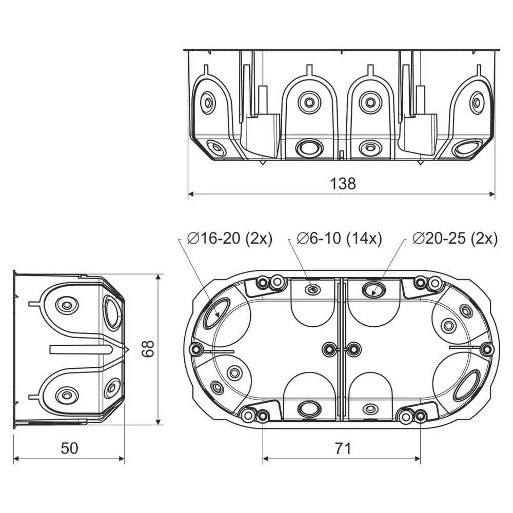• Modern szereléshez használjuk, kombinált keretekkel. A merev kialakítás segíti a könyebb szerelést. A bevezető nyílások rugalmas anyagból készülnek, a behelyezett kábelek vagy csövek esetén is légzáró tömítettséget biztosít, csökkenti a hőveszteséget. Alkalmas alacsony energiafelhasználású- vagy passzív házakhoz. A doboz hátoldalán két jelölőpont jelöli a fúrás helyét. A dupla-menetes felfogató csavarok felgyorsítják a szerelést. A kábel bekötése előtt a membránt pl. egy csavarhúzóval ki lehet lyukasztani. Szerelés előtt a gipszkarton lyuk szélét nem szükséges kisüllyeszteni.