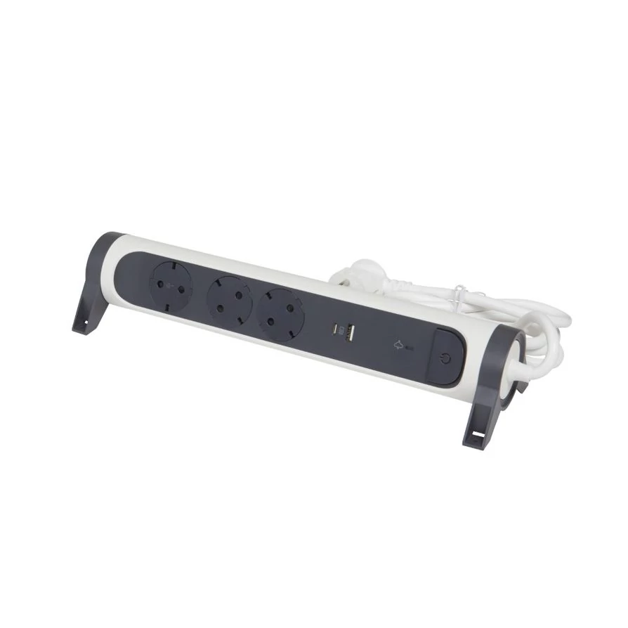 Elosztósor 3 csatlakozóaljzat biztonsági zsaluval, 2P+F csatlakozóval, vezetékkel ellátva. Tengelye körül forgó elosztósor, LED-kijelzővel ellátott BE/KI kapcsolóval, 45°-os szögben elhelyezett bemélyedésekkel. Vezetékezett, 1,5 m-es vezetékkel, 2P+F csatlakozóaljzattal (3 x 1 mm2 vagy 1,5 mm2) szerelve. A túlfeszültség-védelem megvédi az elektromos készülékeket a villámlástól és a túlfeszültségtől. Túlfeszültség-védelem állapotjelzővel. USB-A és USB-C csatlakozóaljzatokkal (3 x 2P+F aljzat). Csavarokkal rögzíthető falra, bútorra, munkafelületre.