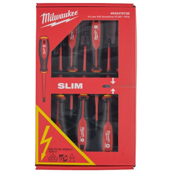 MILWAUKEE 4932478738 VDE Csavarhúzó 3 oldalú markolattal  7 darabos készlet (SL2,5, SL3, SL4, PH2, PZ1, PZ2 Teszter)