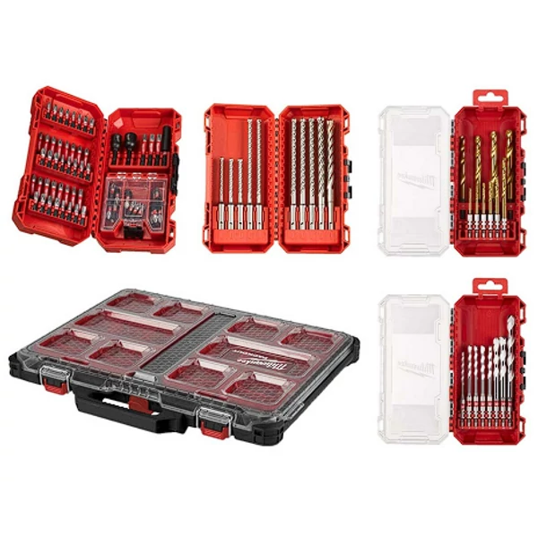 - 98 darabos PACKOUT fúró- és ütvecsavarozó készlet: Több anyaghoz használható fúrófejek és SHOCKWAVE ütvecsavarozó fejek robusztus, hordozható tokban. 10 darabos SHOCKWAVE Red Hex HSS TiN fémfúrókészlet: Ütésálló fúrók ¼”-os hatszögletű szárral és titán-nitrid bevonattal a nagy sebességű használathoz; QUAD EDGE tippekkel, amelyek 135°-os hasított csúccsal és négy vágóéllel rendelkeznek.