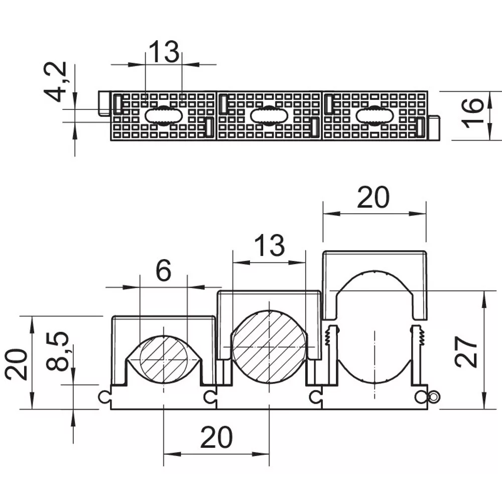 Megjegyzés: Univerzális bilincs kábelek, vezetékek és csövek egyedi rögzítéséhez, minden nagyság, tetszés szerint egymás alá sorolható, ragasztható talppal, hosszanti furattal, M6 menetre felcsavarozható.