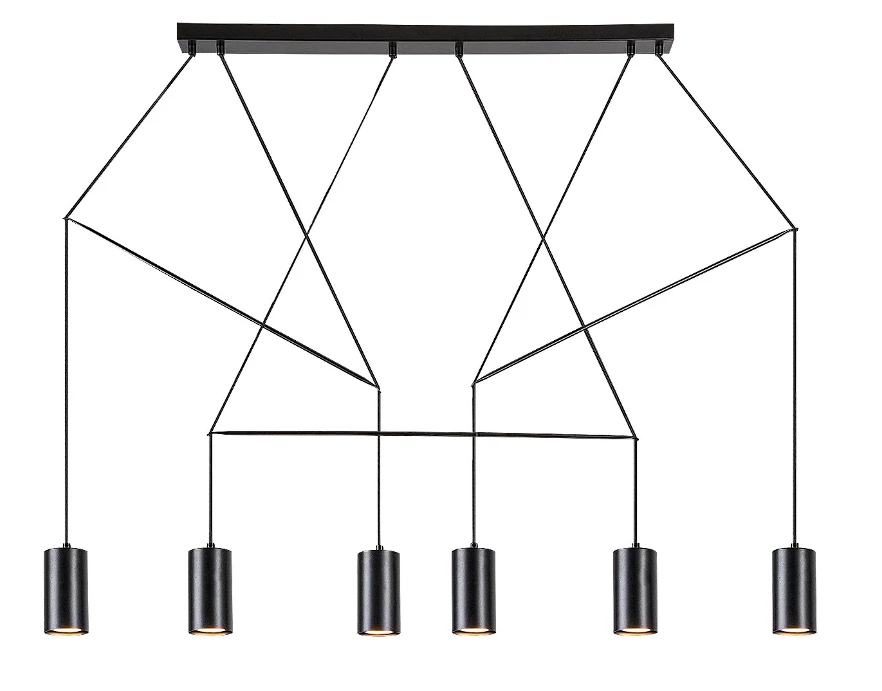 Az indusztriális stílusú Aslaug hatos függesztéket azoknak ajánljuk, akik puritán, mégis figyelemfelkeltő világítási megoldást keresnek modern nappalijukba. A teljes egészében fémből készült, matt fekete modell hat lámpafejét textilkábelek szövevényes rendszere köti össze a dísztalppal. A lámpafejek sorban, egymás mellett, azonos magasságban helyezkednek el, a fényforrásokat alul nyitott, henger alakú búrák takarják. Az Aslaug hosszú, téglalap alakú dísztalp segítségével rögzíthető a mennyezetre, és hat darab, egyenként legfeljebb 50 W teljesítményű fényforrással használható. A foglalatok típusa GU10. Ehhez a függesztékhez természetes fehér fényű fényforrásokat ajánlunk, amelyek tiszta, modern hatást keltenek a nappaliban. Az Aslaug függeszték méretei a következők: szélessége 1170 mm, egy-egy búra átmérője 65 mm, a lámpa belógása 850 mm, beépítési mélysége 740 mm. Ezt a lámpát fényforrások nélkül szállítjuk.