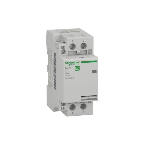 Ez a készülék egy Easy9 CT moduláris kontaktor. Ez a 2P eszköz távvezérelhető, 2 normál esetben nyitott érintkezővel. A névleges áramerősség 40 A, az üzemi feszültség 230 V~ és a vezérlőfeszültség 220-230 V~. Ez az eszköz vezérlőáramkörökhöz használható. Ez a termék megfelel az MSZ 61095 szabványnak. Az elektromos élettartam 200000 ciklus. A maximális kapcsolási műveletek száma napi 100. Az Ui névleges szigetelési feszültség 400 V~. A szennyezettségi fok 2, a túlfeszültség kategória pedig III. A terméket DIN sínre lehet felszerelni. Szélessége 2 modul (18 mm-es osztásban). A termék színe világos szürke (RAL7035). A méret (szélesség) 81mm × (magasság) 36mm × (mélység) 60mm. Az MSZ 60529 szabvány szerint a szekrényben IP20 és IP40 védettségi fokozatú. Az üzemi hőmérséklet -5°C és 60°C között van. A tárolási hőmérséklet -40°C és 70°C között van.