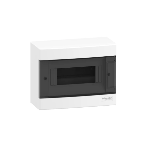 EASY9 EU Kiselosztó, 8 modul, PE+N sínnel, füstszínű ajtóval, falon kívüli