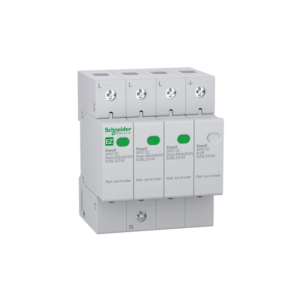 Ez a készülék egy Easy9 túlfeszültség-korlátozó. Ez a termék az Imax 45 kA-es maximális kisülési árama szerint közepes kockázati szint esetén ajánlott (T2). Egy 50A és C karakterisztikájú áramköri megszakítóval kell kiegészíteni. Uc maximális üzemi feszültség 275 V~. A In névleges kisütési áram 20 kA. A maximális feszültségvédelmi szint 1,5 kV A terméket DIN sínre lehet felszerelni. Szélessége 4 modul (18 mm-es osztásban). Az MSZ 60529 szabvány szerint a szekrényben IP40 védettségi fokozatú. Az üzemi hőmérséklet -5-60°C. Tárolási hőmérséklet: -5-70°C. A termék megfelel az MSZ 61643-11 szabványnak.