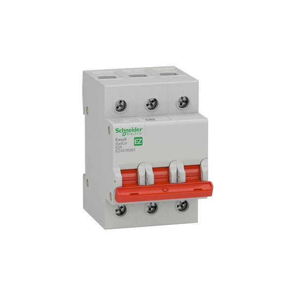 Ez a készülék egy Easy9 moduláris szakaszolókapcsoló. Ezzel a szakaszolókapcsolóval vezérelhetők az áramkörök (terhelés alatti nyitás és zárás). Ezt a terméket a túlterhelés és rövidzárlat ellen már védett terhelési elektromos áramkörök leválasztására is használják. Az MSZ 60947-3 szabvány szerinti leválasztásra alkalmas pozícióérintkező jelzéssel rendelkezik. Ez egy 3P szakaszolókapcsoló 63A névleges áramerősséggel. Az elektromos élettartam 1500 ciklus, a mechanikai élettartam pedig 8500 ciklus. Az Ue névleges üzemi feszültsége 400 V~. Az Ui névleges szigetelési feszültség 500 V~. Uimp névleges lökő-feszültsége 4 kV. Az üzemi frekvencia 50 Hz vagy 60 Hz. A terméket DIN sínre lehet felszerelni. Szélessége 3 modul (18 mm-es osztásban). A méret (szélesség) 54mm × (magasság) 81mm × (mélység) 66.5mm. A színe világosszürke (RAL7035). Az MSZ 60529 szabvány szerint a szekrényben IP20 vagy IP40 védettségi fokozatú. A szennyezettségi fok NA. Az üzemi hőmérséklet -5 - 55°C. Tárolási hőmérséklet: -5 - 70 °C. A termék megfelel az MSZ 60947-3 szabványnak.