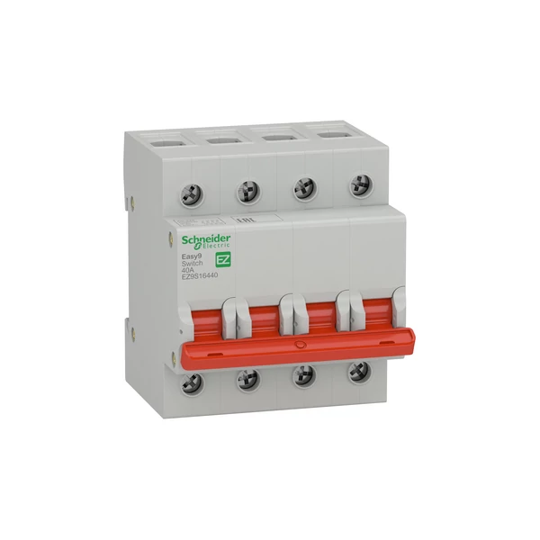 Ez a készülék egy Easy9 moduláris szakaszolókapcsoló. Ezzel a szakaszolókapcsolóval vezérelhetők az áramkörök (terhelés alatti nyitás és zárás). Ezt a terméket a túlterhelés és rövidzárlat ellen már védett terhelési elektromos áramkörök leválasztására is használják. Az MSZ 60947-3 szabvány szerinti leválasztásra alkalmas pozícióérintkező jelzéssel rendelkezik. Ez egy 4P szakaszolókapcsoló 40A névleges áramerősséggel. Az elektromos élettartam 1500 ciklus, a mechanikai élettartam pedig 8500 ciklus. Az Ue névleges üzemi feszültsége 400 V~. Az Ui névleges szigetelési feszültség 500 V~. Uimp névleges lökő-feszültsége 4 kV. Az üzemi frekvencia 50 Hz vagy 60 Hz. A terméket DIN sínre lehet felszerelni. Szélessége 4 modul (18 mm-es osztásban). A méret (szélesség) 72mm × (magasság) 81mm × (mélység) 66.5mm. A színe világosszürke (RAL7035). Az MSZ 60529 szabvány szerint a szekrényben IP20 vagy IP40 védettségi fokozatú. A szennyezettségi fok NA. Az üzemi hőmérséklet -5 - 55°C. Tárolási hőmérséklet: -5 - 70 °C. A termék megfelel az MSZ 60947-3 szabványnak.