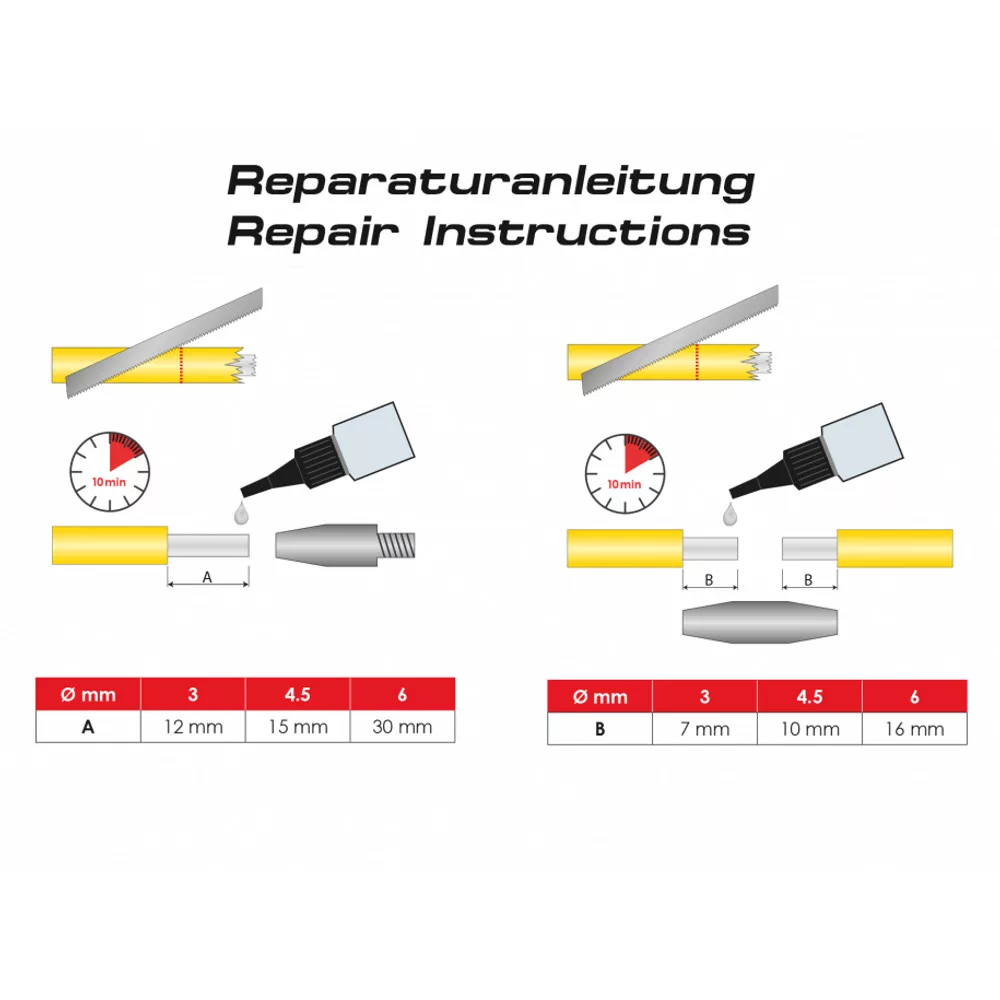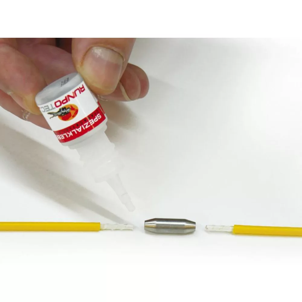 3 g speciális ragasztó 3 mm-es, 4,5 mm-es és 6 mm-es üvegszálas rudak javításához. A RUNPOTEC SPECIÁLIS RAGASZTÓJA nagyon gazdaságos. Egy csepp elegendő kb. 3-5 cm² ragasztófelület. Az utasításokat lásd a biztonsági adatlapon!