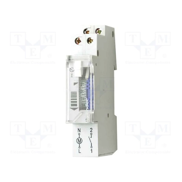 12.11-es típusú mechanikus kapcsolóórák 1 váltóérintkezővel, 16 A, napi programmal*, 17,6 mm széles, TS 35 mm-es sínre szerelhető (EN 60715) kivitel.