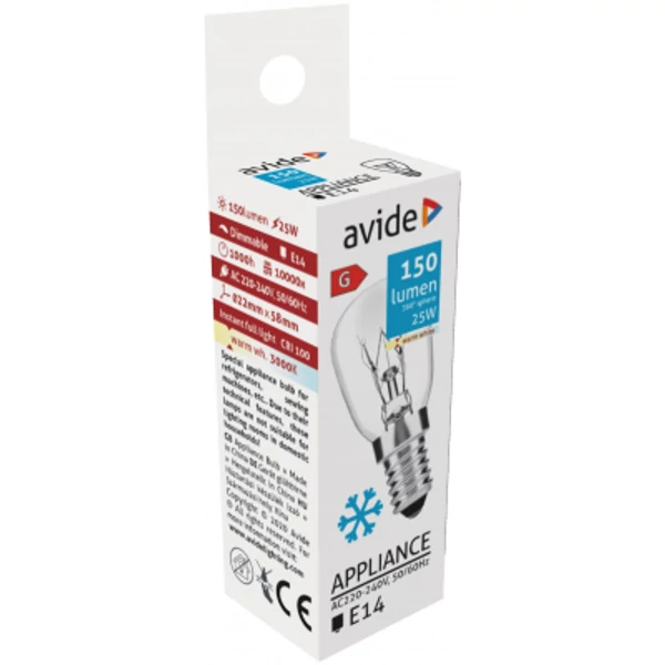 - Az Avide termékpalettája 15 és 25 W-os, E14-es talpú, meleg fényű, 3000 K lumen fényerejű izzókat is tartalmaz, amelyeket hűtőszekrényben és sütőben használnak.