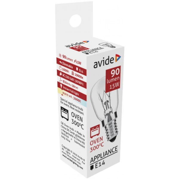 - Az Avide termékpalettája 15 és 25 W-os, E14-es talpú, meleg fényű, 3000 K lumen fényerejű izzókat is tartalmaz, amelyeket hűtőszekrényben és sütőben használnak.