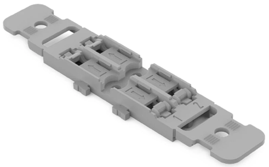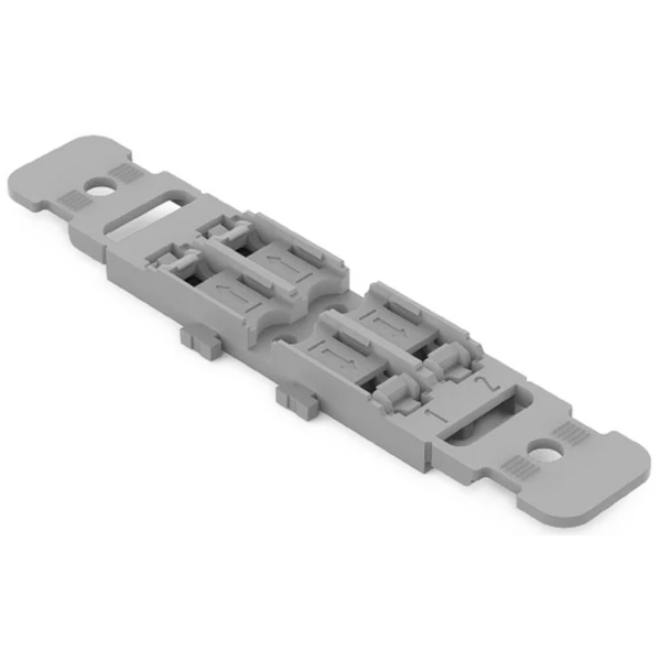 A WAGO 221‑2502 rögzítő adapter egy kétpólusú (dupla) tartó csatlakozókhoz, melyet kifejezetten a WAGO 221-2411 típusú karos összekötőkhöz terveztek. Ez az adapter csavaros rögzítésre alkalmas, és beépített tehermentesítővel rendelkezik — a kábelt egy kábelkötegelő segítségével lehet rögzíteni, így csökken annak húzóterhelése. Színe szürke, anyaga strapabíró, a kialakításának köszönhetően stabil tartást nyújt a szerelés során. Fizikai méretei: szélessége 20,8 mm, magassága a felülettől 6,5 mm, mélysége 100 mm, de a tehermentesítő rész letörhető, és lerövidíthető 56 mm-re is. Tömege körülbelül 4,2 gramm. Az adapter eredetileg Kínában gyártott, és megfelel a RoHS környezetvédelmi előírásoknak.