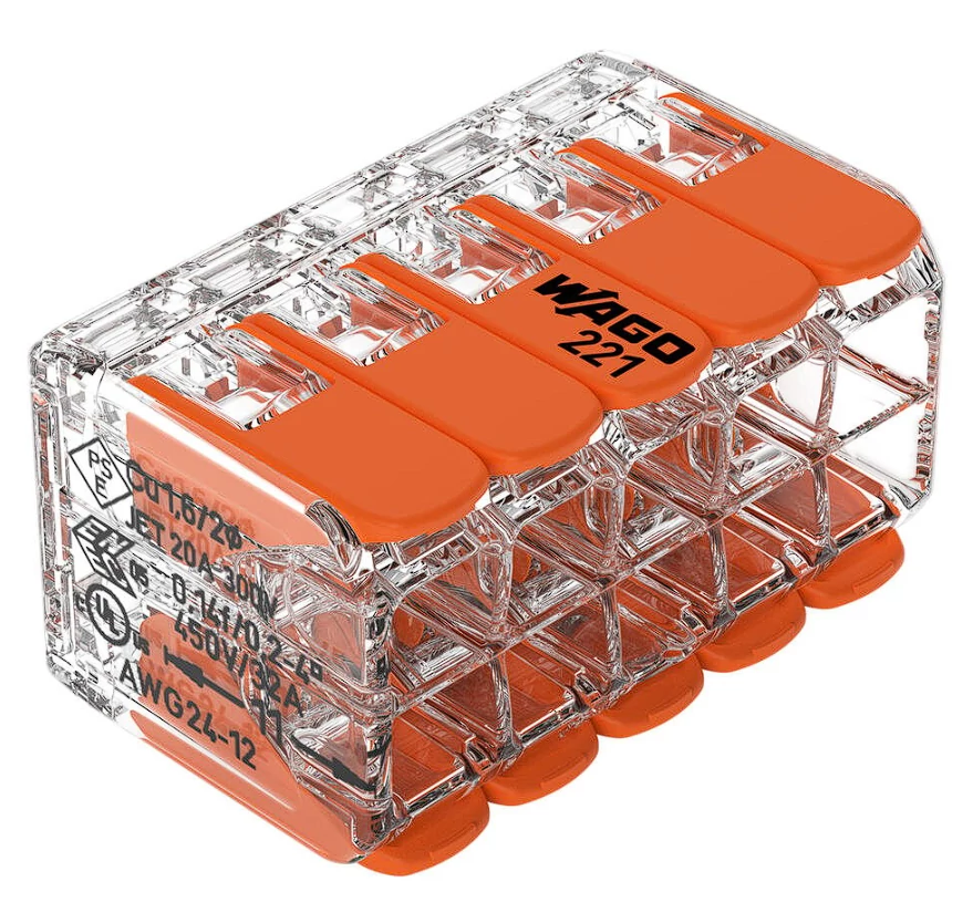A WAGO 221‑420 vezetékösszekötő egy karos (leveres) COMPACT típusú összekötő, amelyen tíz (10) kapocs található. A vezetékek befogadására vonatkozó keresztmetszet 0,2 mm²‑től egészen 4 mm²‑ig terjed mind tömör, mind sodrott illetve hajlékony vezetékek esetén. A csupaszolt vezetéket körülbelül 11 mm hosszban kell előkészíteni a csatlakoztatáshoz. A névleges névleges feszültség 450 V, névleges áram 32 A. A készülékház áttetsző, az emelőkar narancssárga színű, az anyaga polikarbonát. A működési hőmérséklet legfeljebb +85 °C (T85). A kapocstechnika a WAGO CAGE-CLAMP® rendszer, amely biztos, oldható kötést tesz lehetővé – a karokat felhúzva nyitható a kapocs, befűzöd a vezetéket, majd visszaengedve rögzítheted azt.