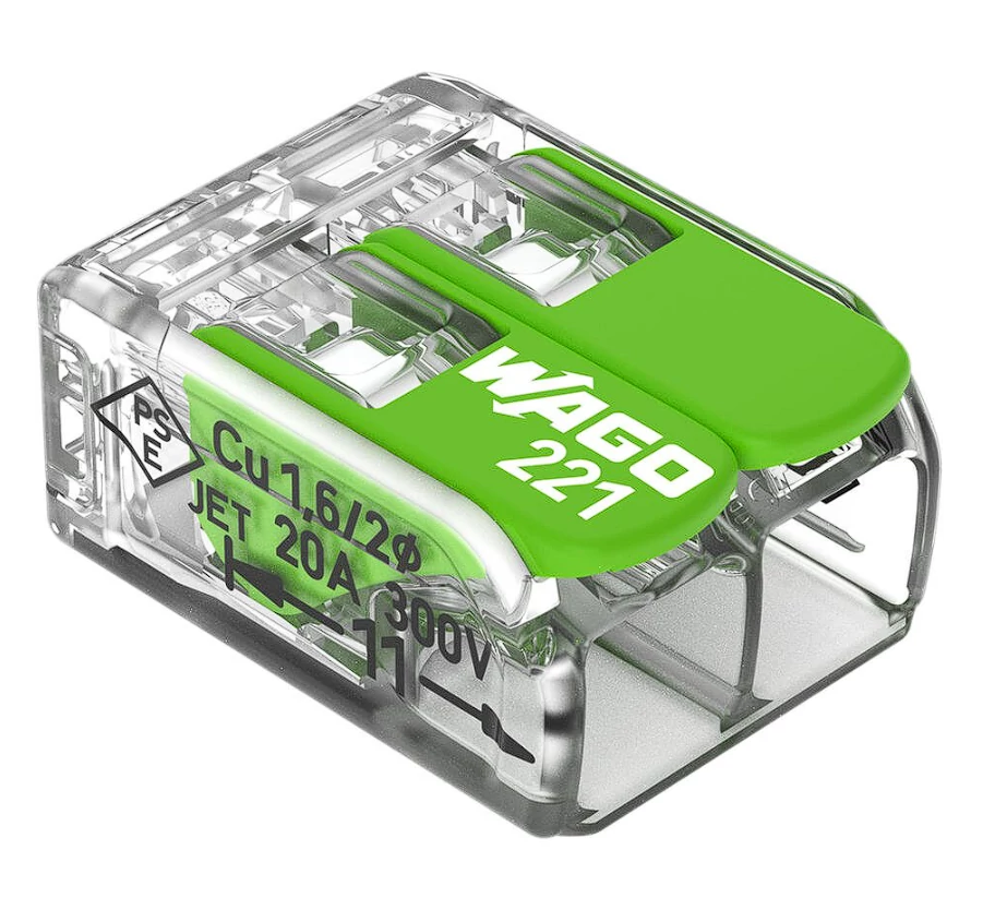 A WAGO 221‑422 Green Range vezeték összekötő egy kétpólusú, oldható karos (leveres) összekötő, amely akár 0,2‑4 mm² keresztmetszetű tömör vagy sodrott rézvezetékeket is fogad. Az átlátszó ház lehetővé teszi a vezetékkapcsolás láthatóságát, míg a zöld karok részben újrahasznosított és bio-cirkuláris anyagból készülnek, így alacsonyabb a fosszilis erőforrás-felhasználása. A csatlakozó maximális névleges áramerőssége 32 A, névleges feszültsége 450 V, és működés közben +85 °C-ig használható (T85). A kapocsrendszer WAGO CAGE-CLAMP®, ami biztos és ismételt kötést tesz lehetővé: a leveremelt kart felhúzva lehet bedugni a vezetéket, majd visszaengedve rögzíteni.