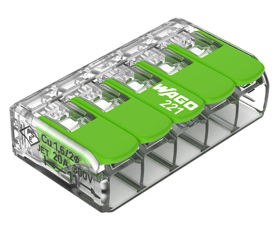Karos toldócsatlakozónk (cikkszám: 221-425) zökkenőmentes elektromos szerelésekhez készült. Az interkom rendszer kábelezésétől az elektromos sütőkig – a különböző vezetőtípusok csatlakoztatása gyors és egyszerű a WAGO kompakt 221-es sorozatú toldócsatlakozójával. A vezetőket csak akkor szabad karos toldócsatlakozóhoz csatlakoztatni, ha a szalaghosszuk 11 mm. Ennek a toldócsatlakozónak a névleges feszültsége 450 V, és akár 32 A áramot is képes kezelni, így ideális nagy terhelésű alkalmazásokhoz. Ez a termék vezetősarukkal rendelkezik, és CAGE CLAMP®-et használ. Híres univerzális csatlakozónk, a CAGE CLAMP® élen jár a csatlakozástechnika és az elektromos összekapcsolások terén. A méretek (30 x 8,4 x 18,6) mm (szélesség x magasság x mélység). A karos toldócsatlakozó 0,2 mm² és 4 mm² közötti vezetőkeresztmetszetekhez alkalmas.